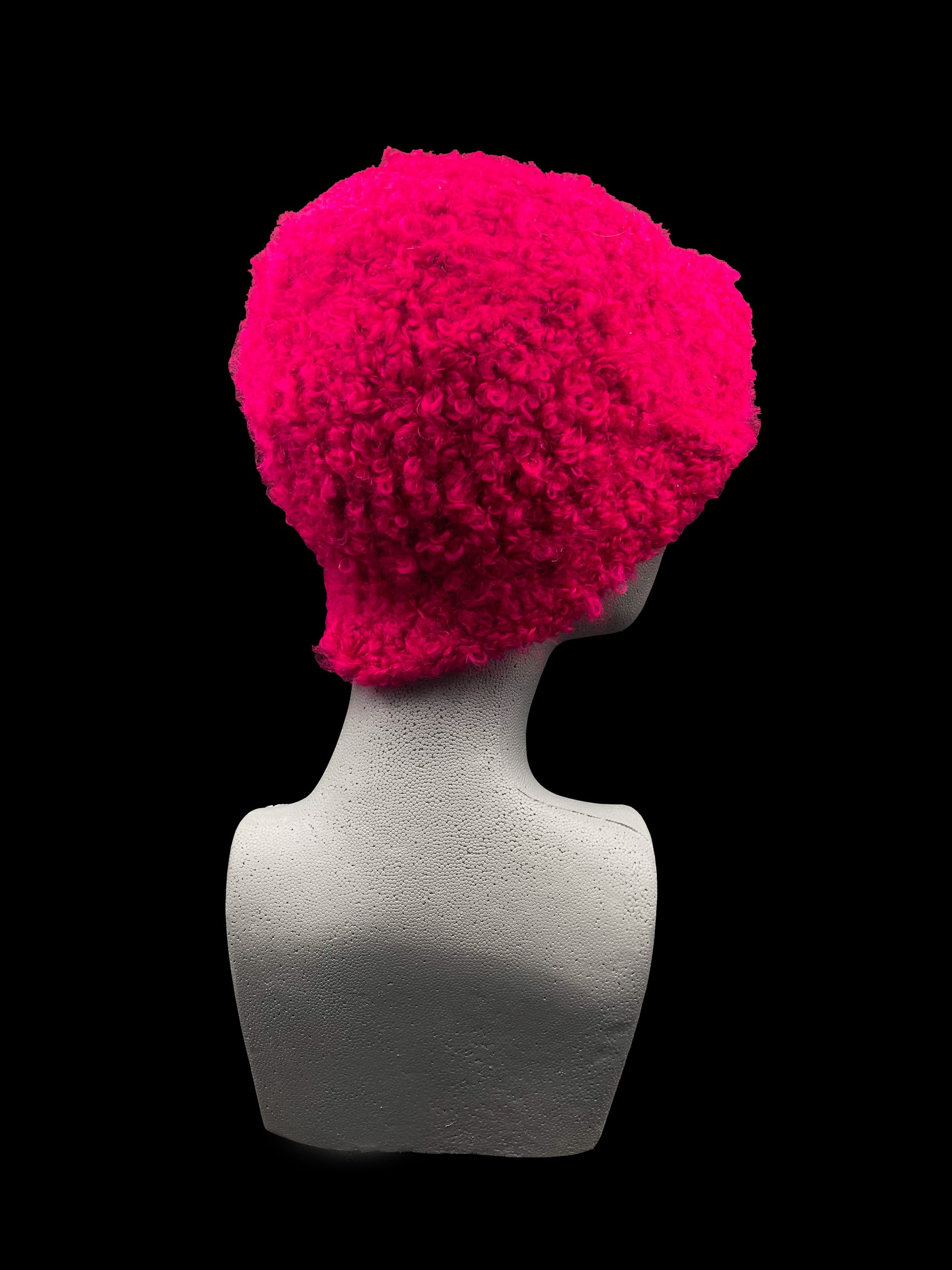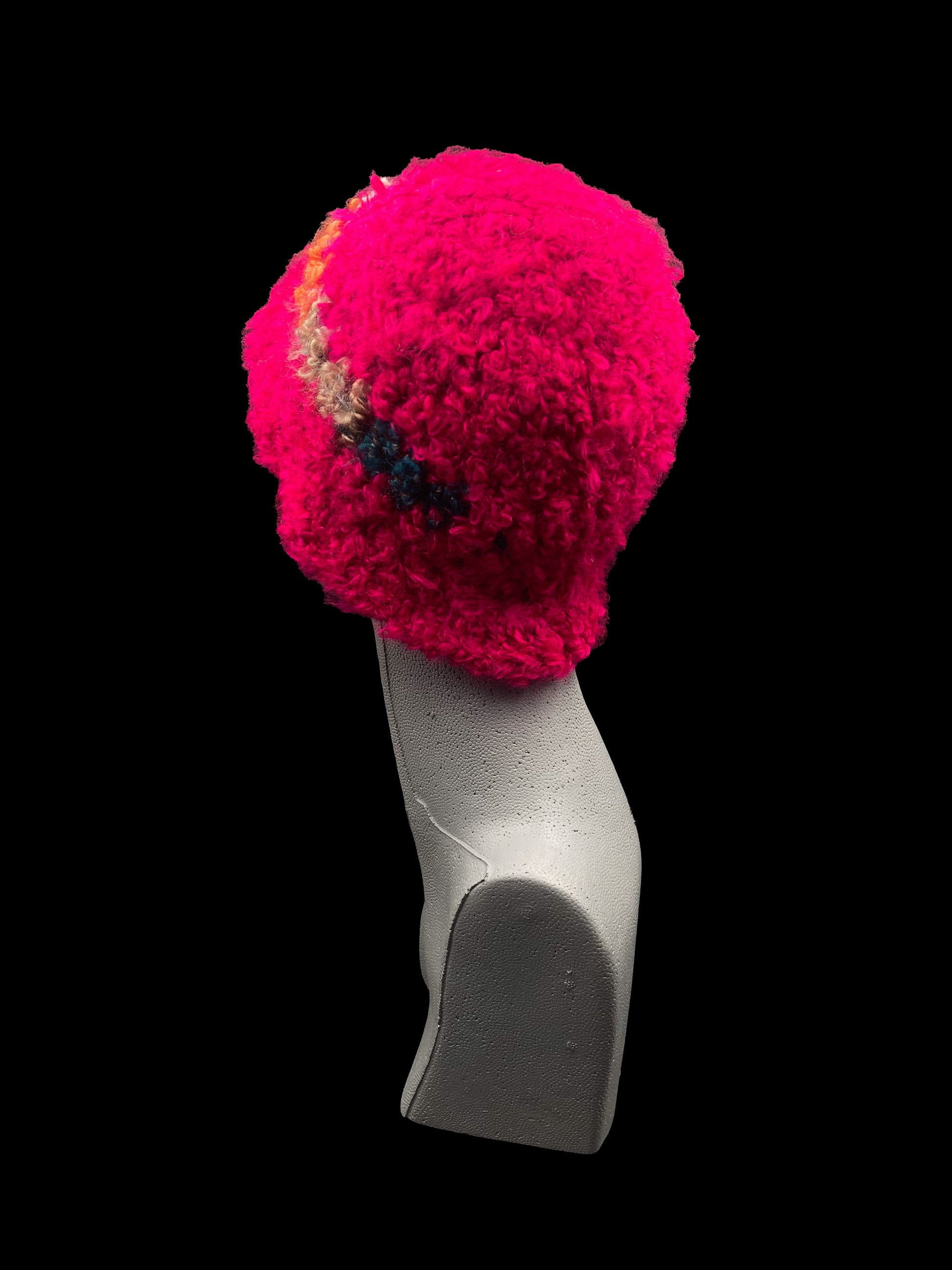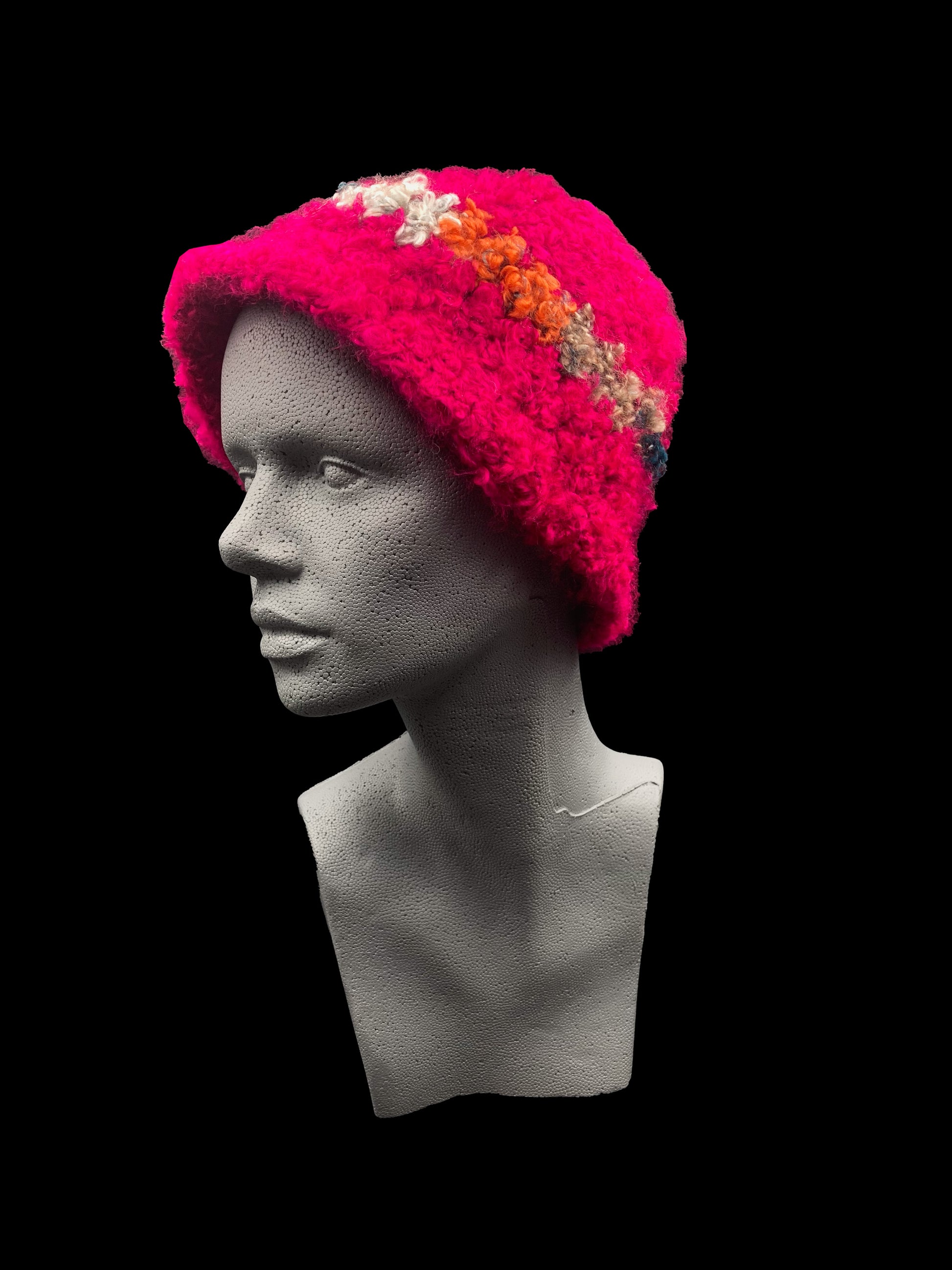 Handmade crochet bucket-hat, red-pink with a multicoloured strip. Designed for a unisex fit, one size fits all.