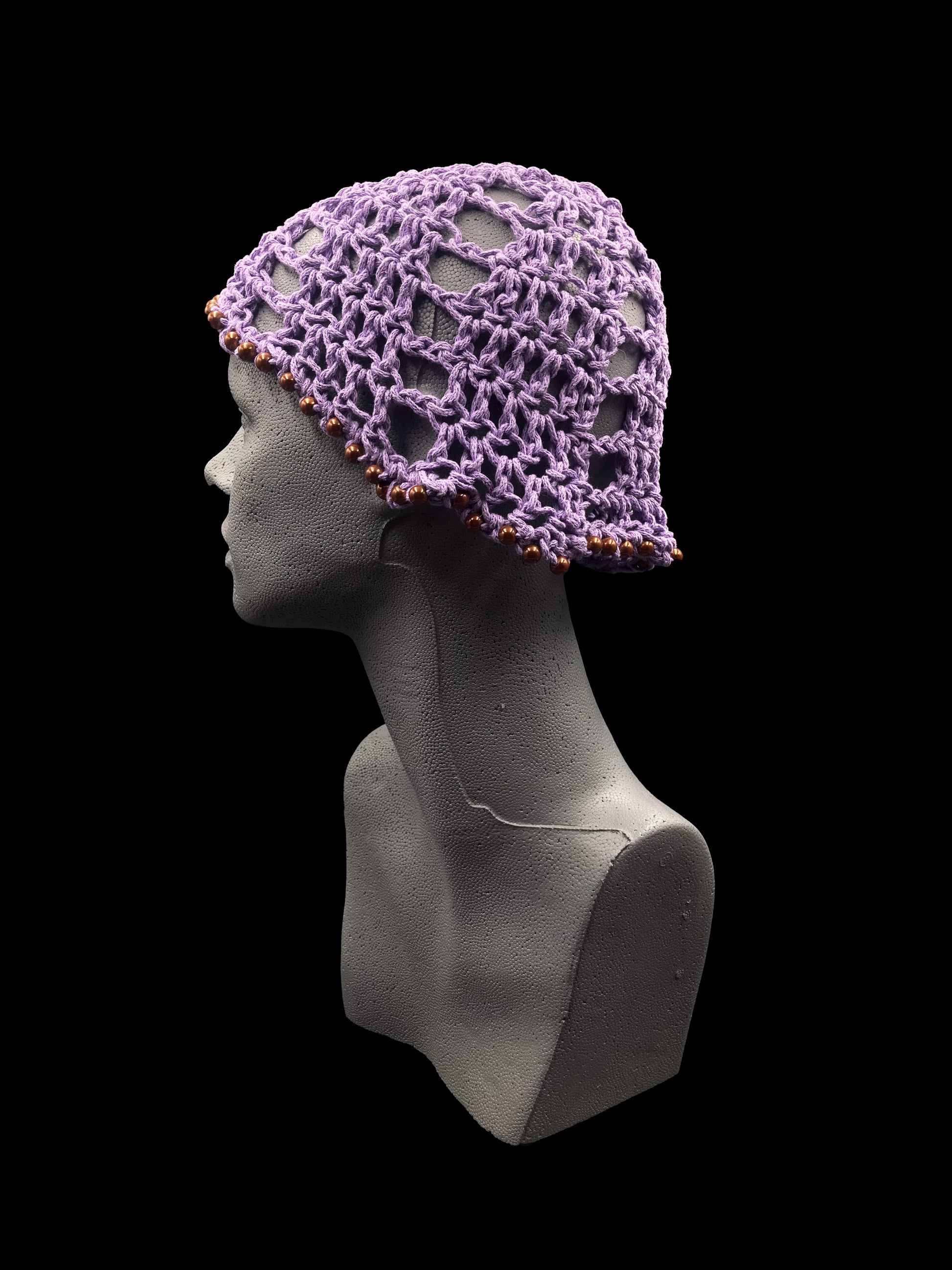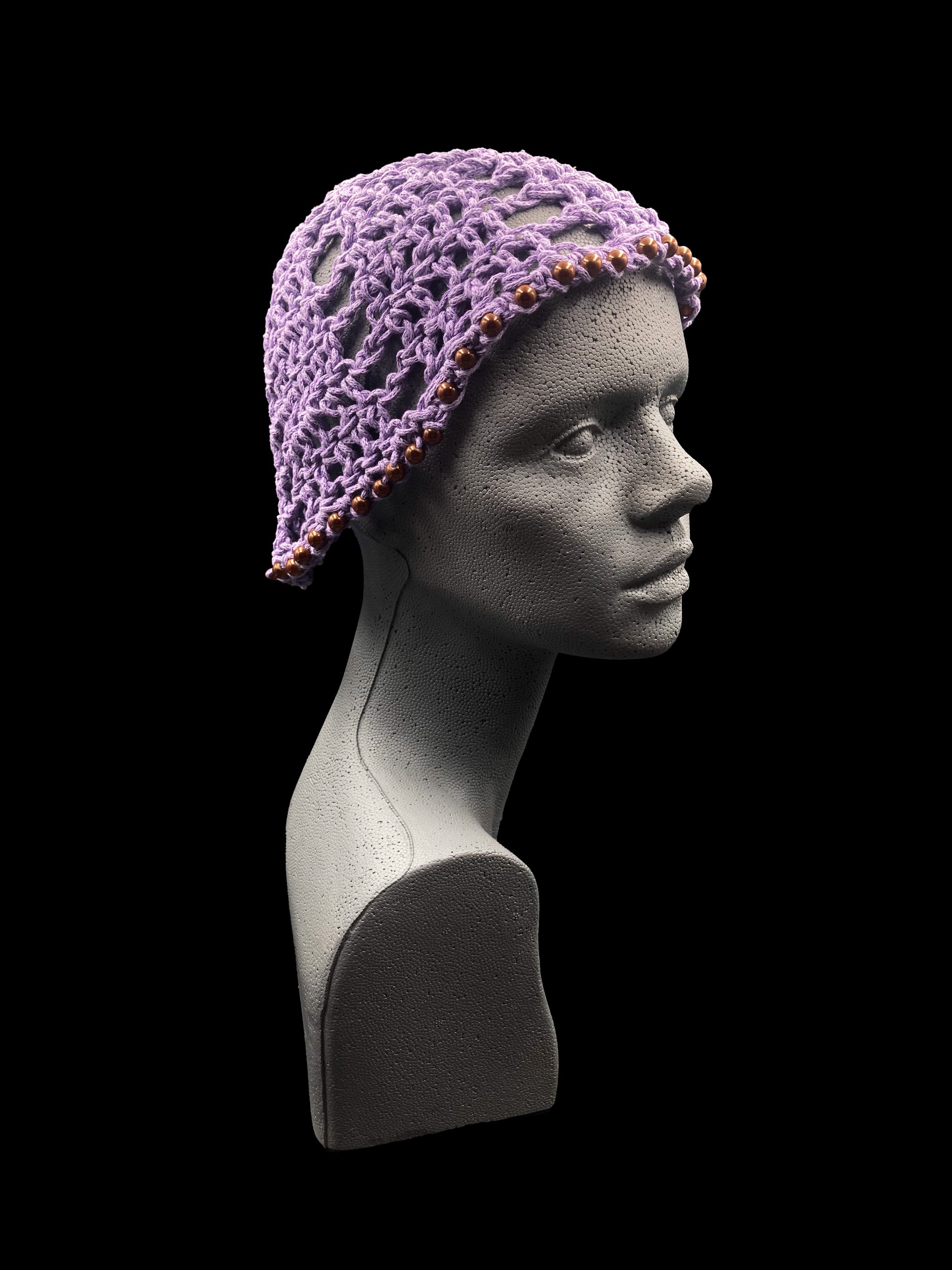 Handmade crochet beanie, purple with brown beads. Designed for a unisex fit, one size fits all.