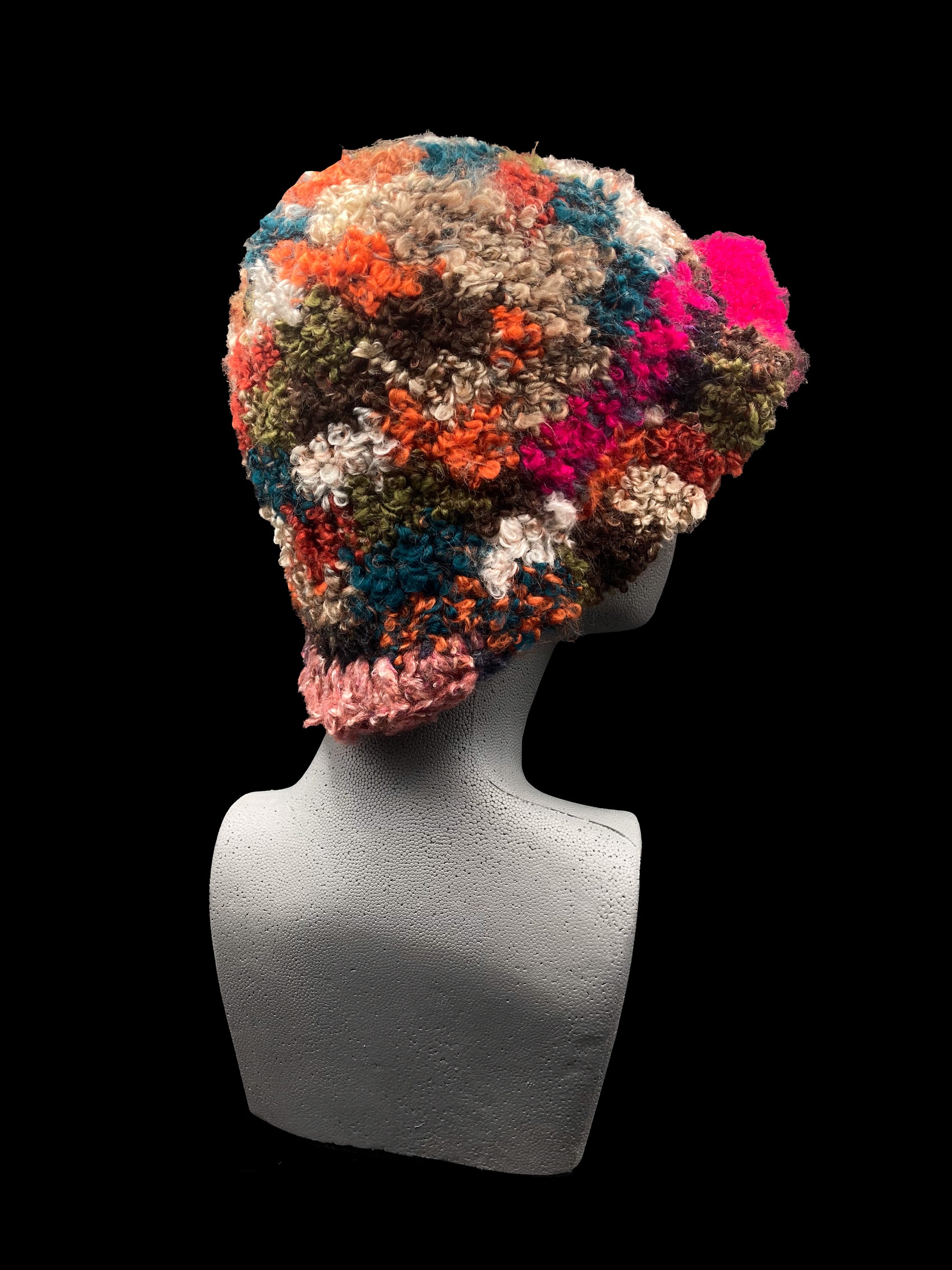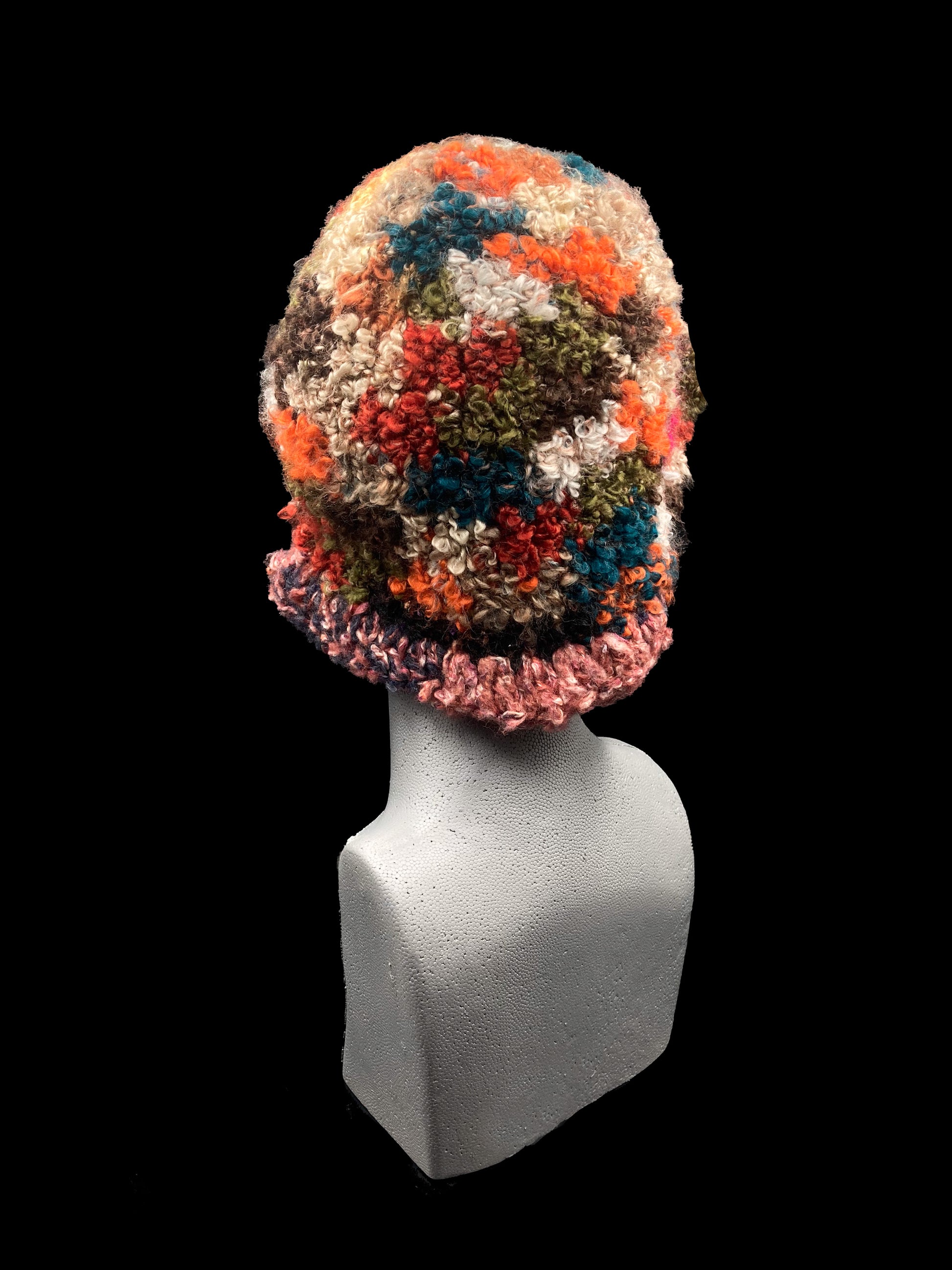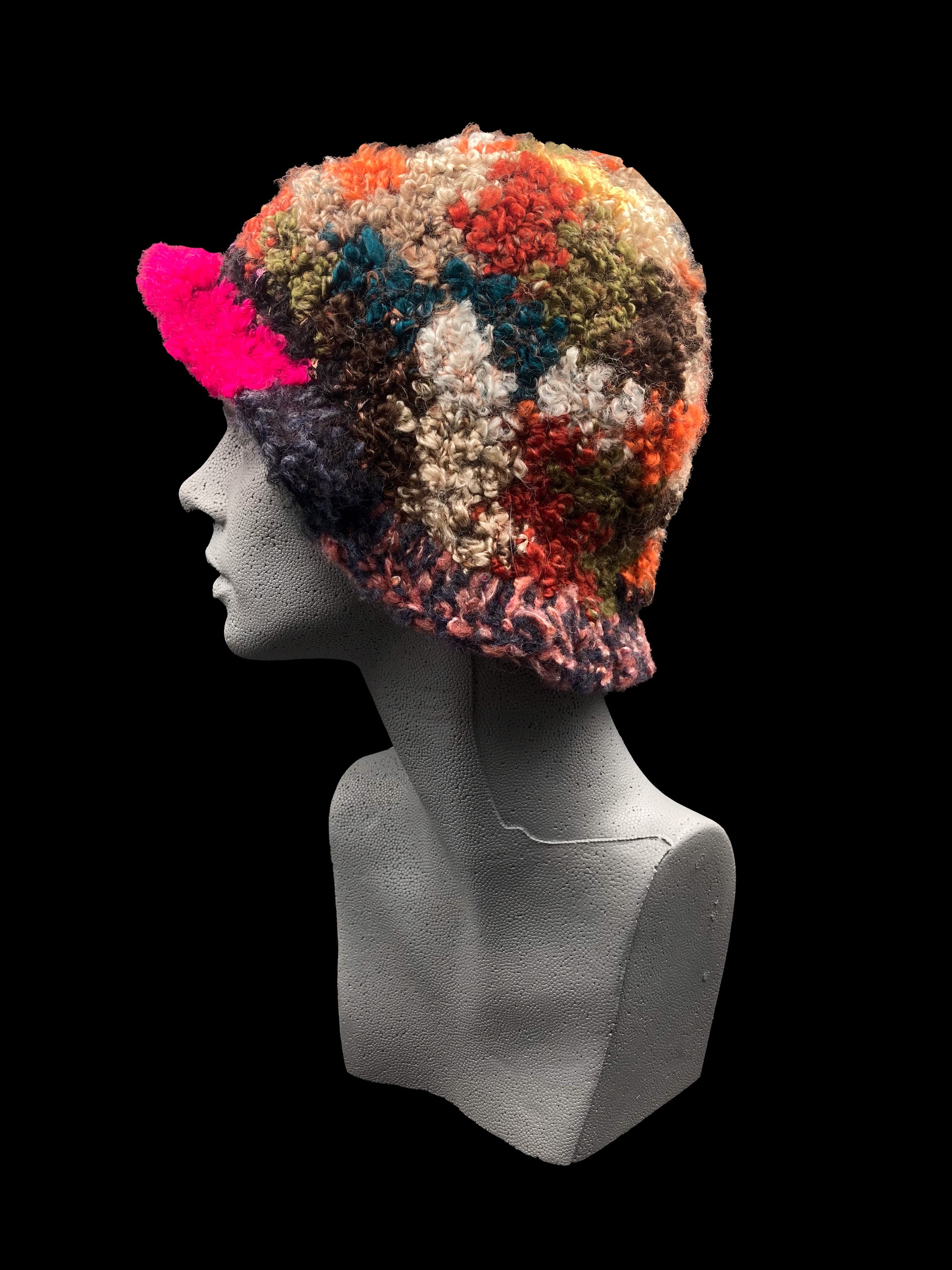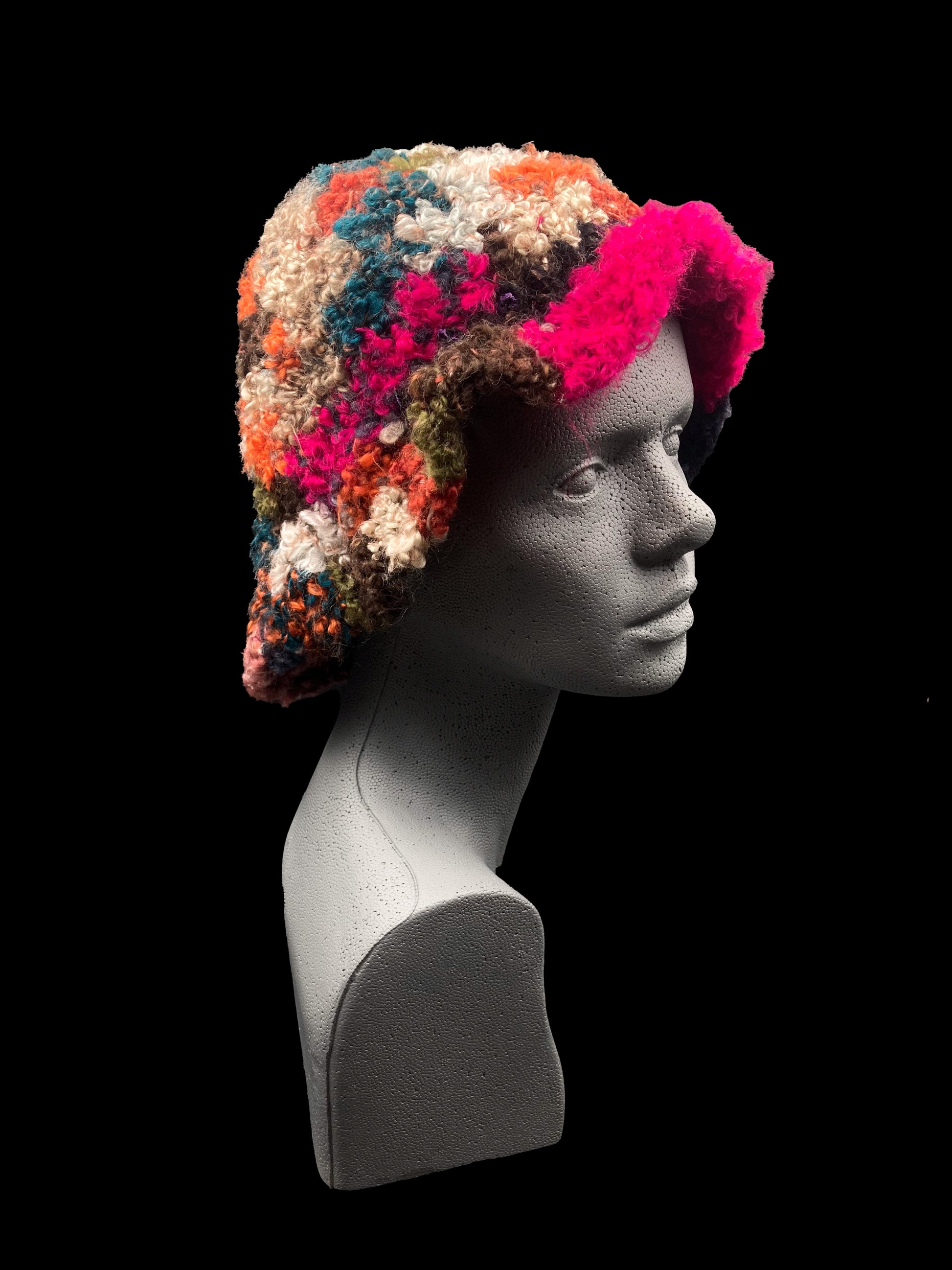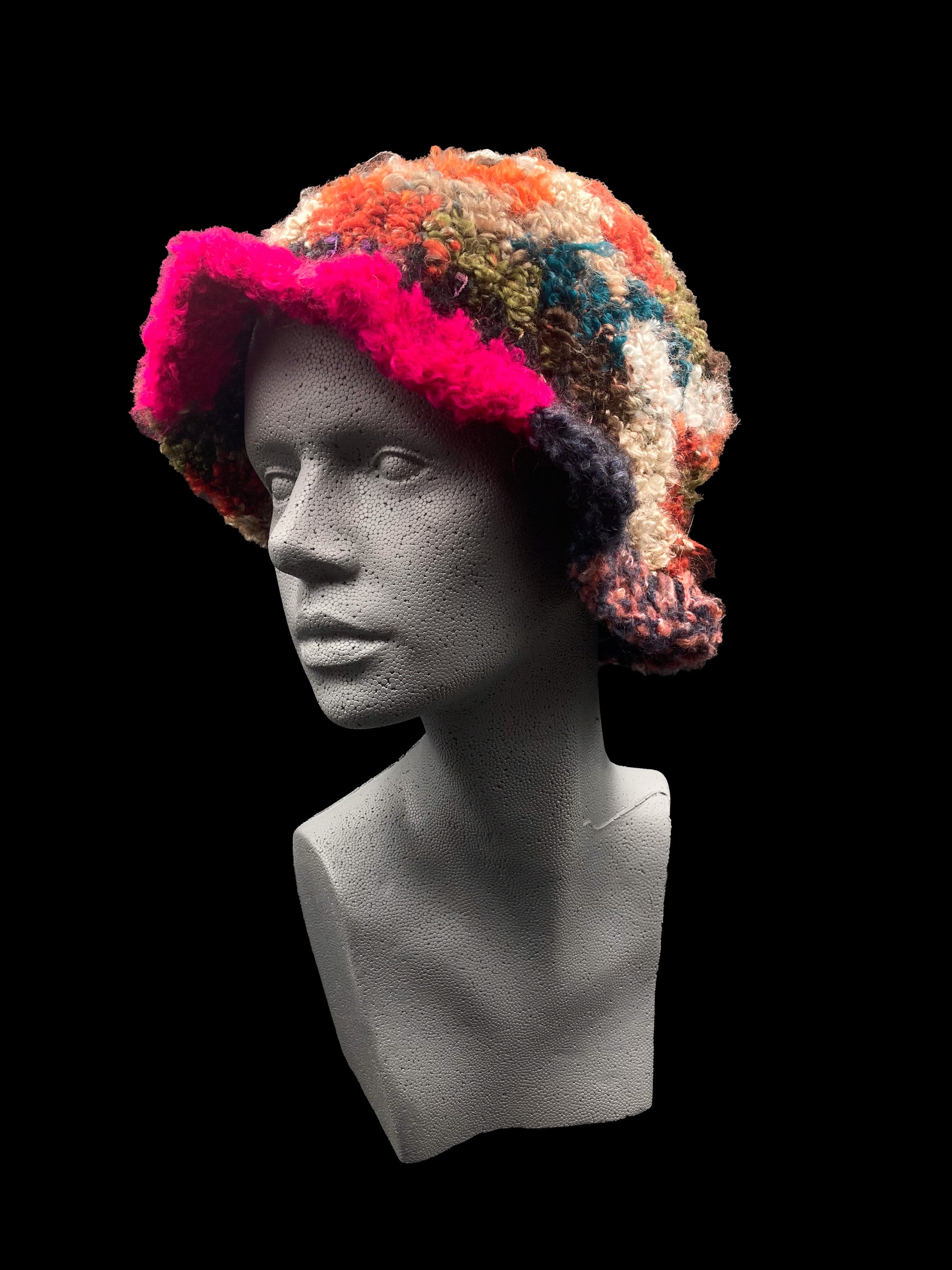 Handmade crochet bucket-hat, multicoloured. Designed for a unisex fit, one size fits all.